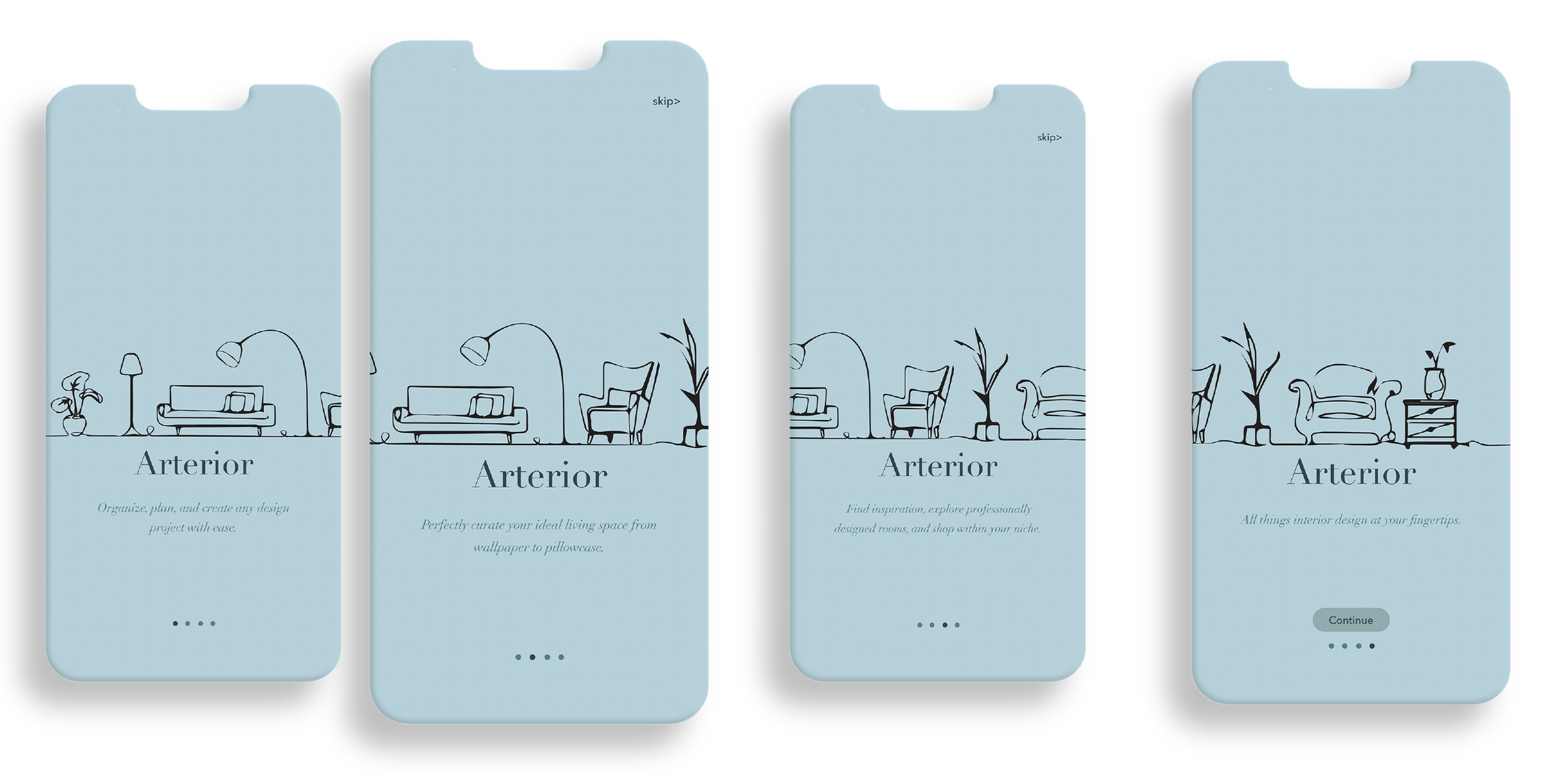 Onboarding slideshow: This 4 page slideshow greets new users to the Arterior app with a playful furniture line drawing as welcoming gesture. These illustrations are paired with brief blurbs that clearly state our purpose and intentions (ex; “Organize, plan, and create any design project with ease.” and, “Perfectly curate your ideal living space from wallpaper to pillowcase.” ).