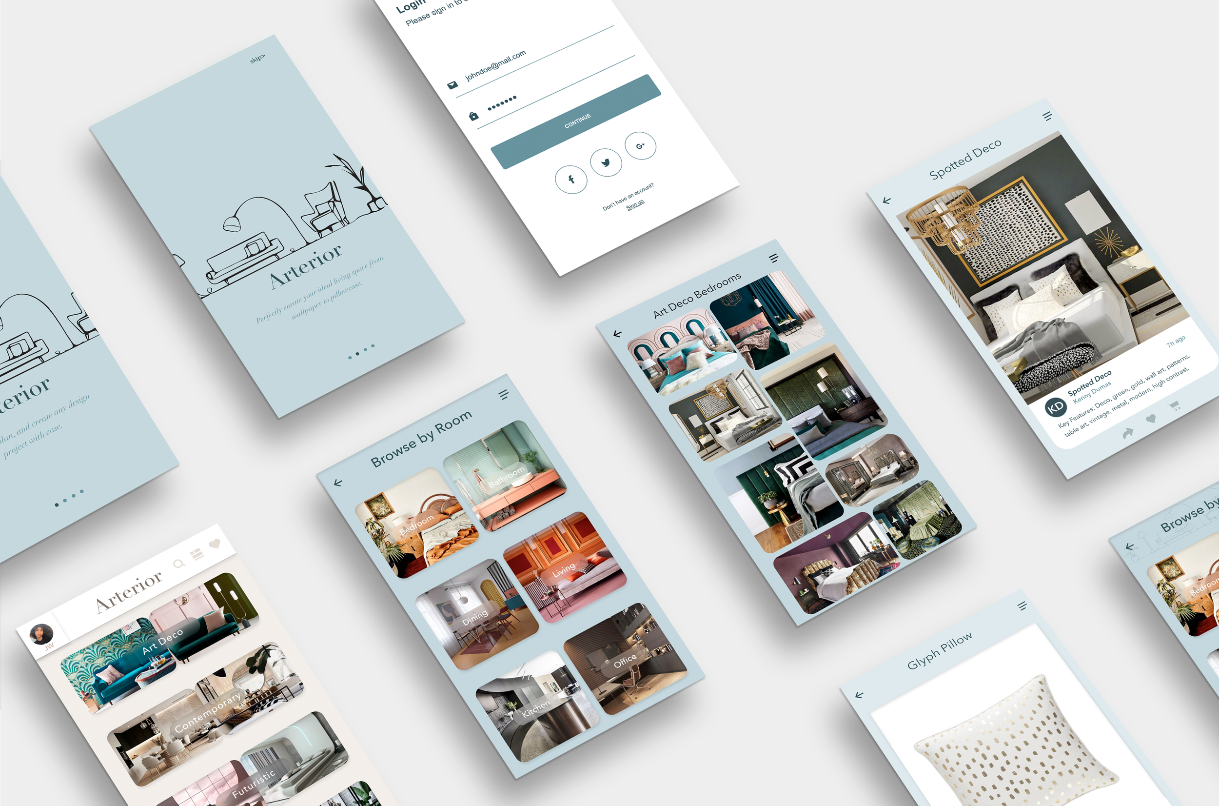 Over time, Arterior gathers data from favorited rooms/items, saved rooms/items, and search entries to personalize a feed unique to each user. Personalized feeds include suggested rooms, pieces, and designers to allow users to browse a smaller and more concentrated selection. From this feed rooms and items can be saved and shopped.